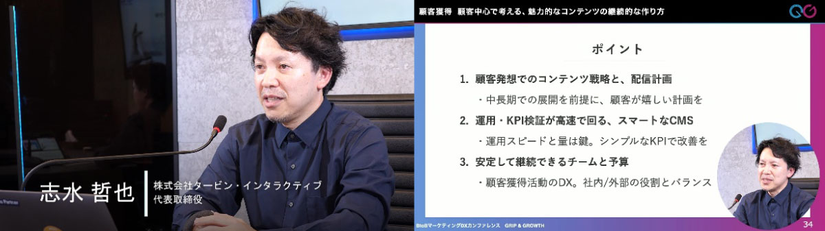 最後にポイントとして・ペルソナ、ジャーニーから導かれるコンテンツの配信計画をまとめること、・スマートなCMSを設計し運用 / KPI検証を高速で回すこと、・DXを一過性の施策と考えず経営課題として考えることの3点を挙げ、「コンテンツは全体をドライブする大きな鍵。まだ見ぬ潜在顧客が喜ぶコンテンツをぜひつくり続けてほしい」とまとめました。