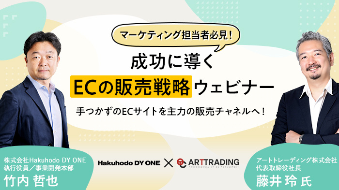 そこで、本ウェビナーでは、EC業界におけるマーケティング支援で豊富な実績と知見を持つHakuhodo DY ONEと、ECサイトの構築から運営・コンサル・フルフィルメント・在庫管理システム開発まで、ECに関するトータルサポートを提供するアートトレーディングが、ECサイトで成功するためのメソッドを解説していきます。ポジションニング分析(自社分析、競合分析、SWOT分析、ターゲット・ペルソナ)方法から最適な広告施策、顧客体験向上に向けたECサイトの設計等について、事例を交えながらお話しします。企業のマーケティング・Webサイトご担当者様、ECサイトの売上・利益の最大化を目指すご担当者様、必見のウェビナーです。